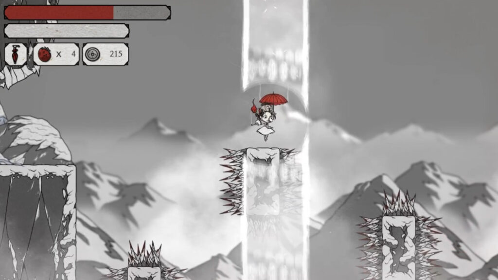 Besides just in the combat, saving a few extra buttons could have helped a lot in other parts of the game too. As mentioned most of the game’s weapons have a secondary use that let you explore the world a little more. When it comes to this secondary application, one weapon shines above the rest, since there are so many platforming challenges that use its special feature. The umbrella makes you fall more slowly and protects you from any waterfalls that would otherwise block your path. Any time the game wants you to use this ability though you have to switch off of whatever weapon you were using and use the umbrella instead. The actual weapon function of the umbrella isn’t too bad, but at one part of the game in particular having to switch between your lamp and back to the umbrella gets particularly cumbersome. I don’t know if there was some part of the afterlife folklore that gives significance to the seven weapons you find that could explain their inclusion, but it would have been nice if things like the light source or ability to reflect bullets was just added to your scythe, and the ability to float with the umbrella was given its own button. The platforming is otherwise fairly well executed with a lot of great verticality and a variety of challenges to overcome. Other movement mechanics like switching places with your frog companion or air dashing are executed quite nicely.